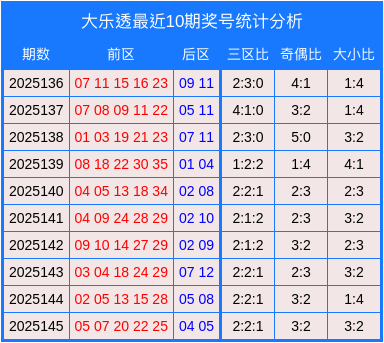 其中前区的三区比为2:2:1,奇偶比为3:2,大小比为3:2。