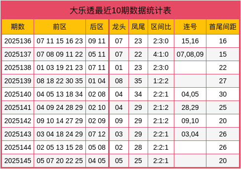 大乐透第25145期奖号为:05、07、20、22、25+04、05,其中前区号码奇偶比为3:2,大小比为3:2,012路比为0:3:2,三区比为2:2:1。